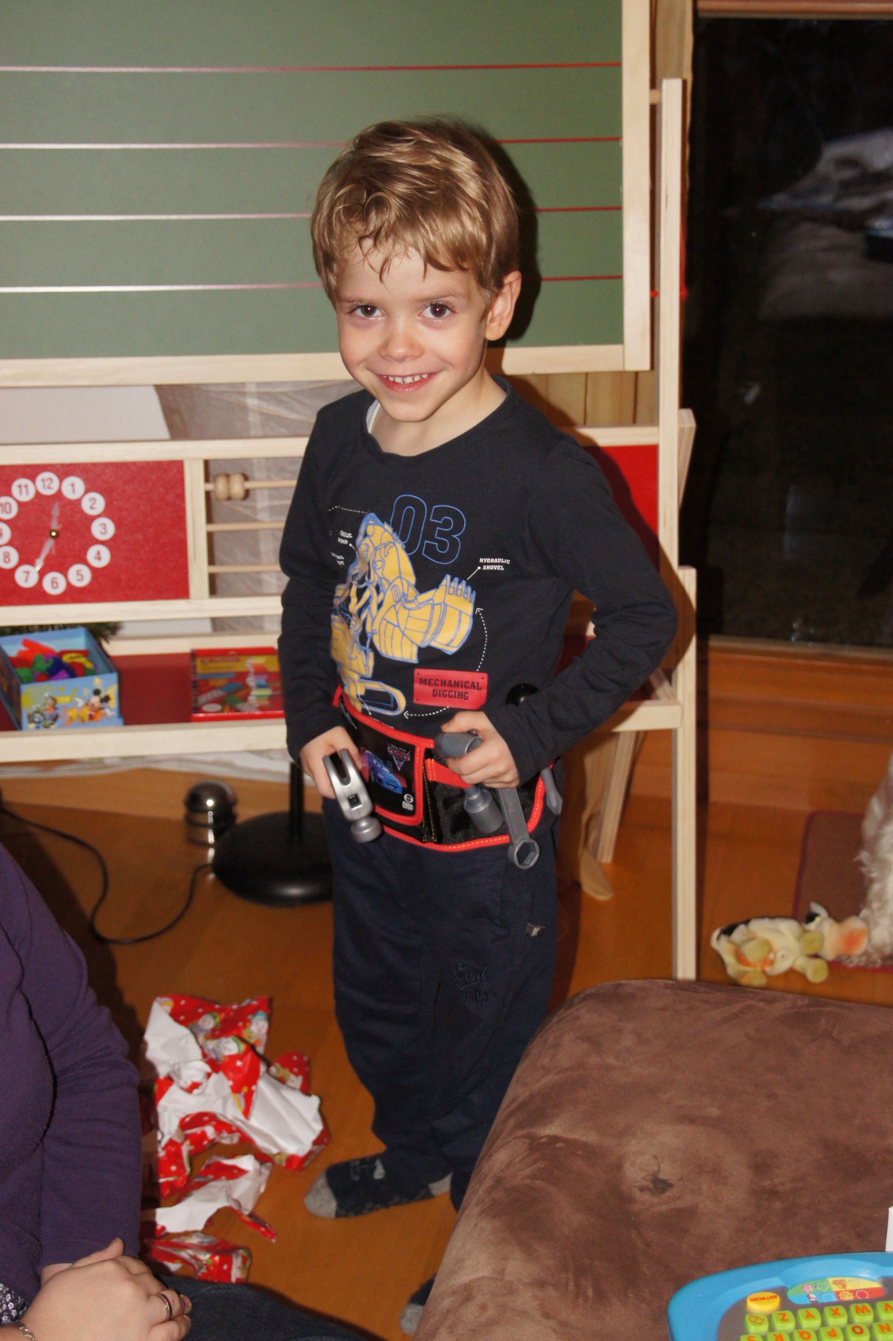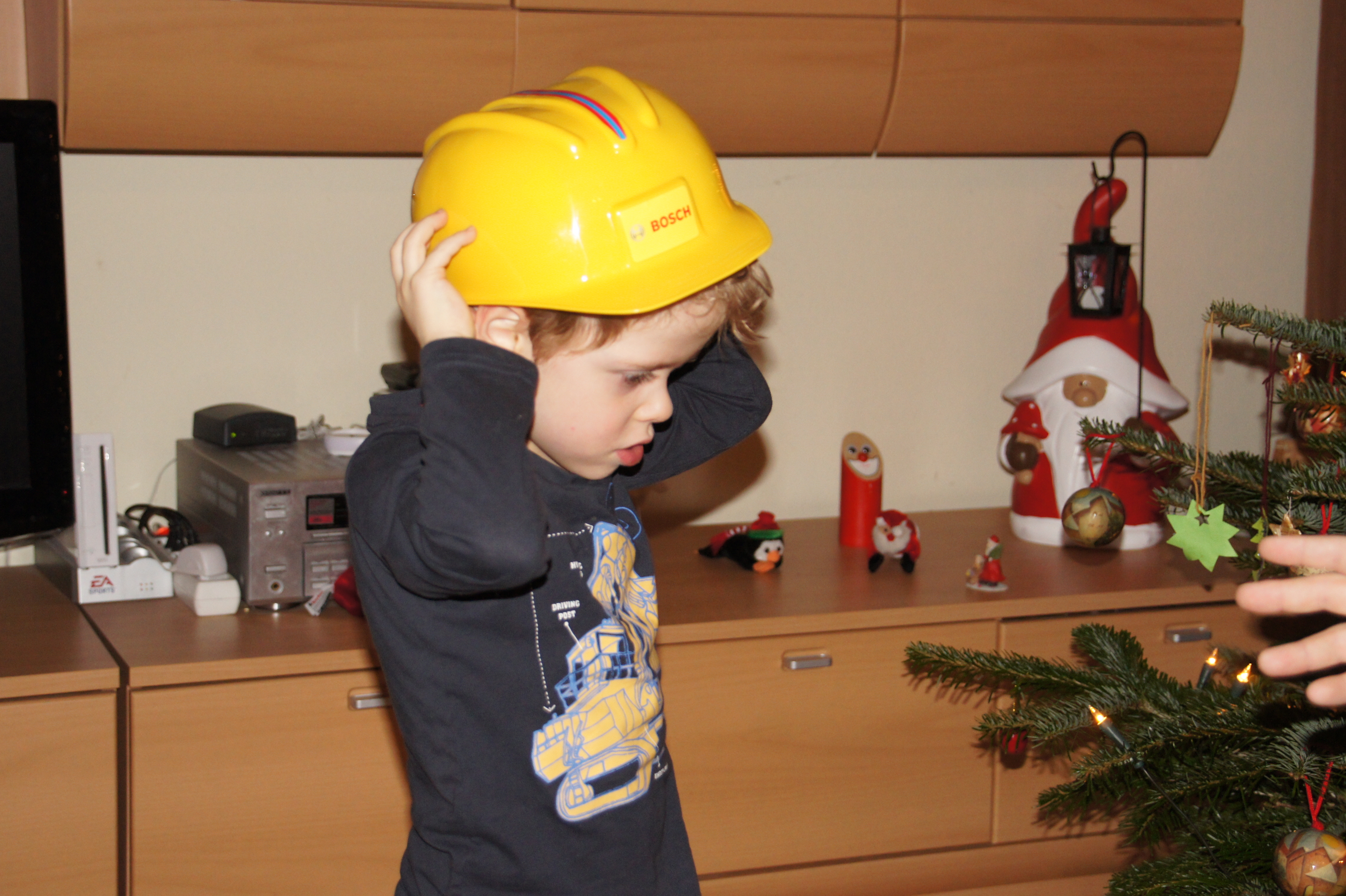 Ein Werkzeugürtel! Stolz wie Bolle! Und natürlich, Sicherheit! Ein Helm dazu.